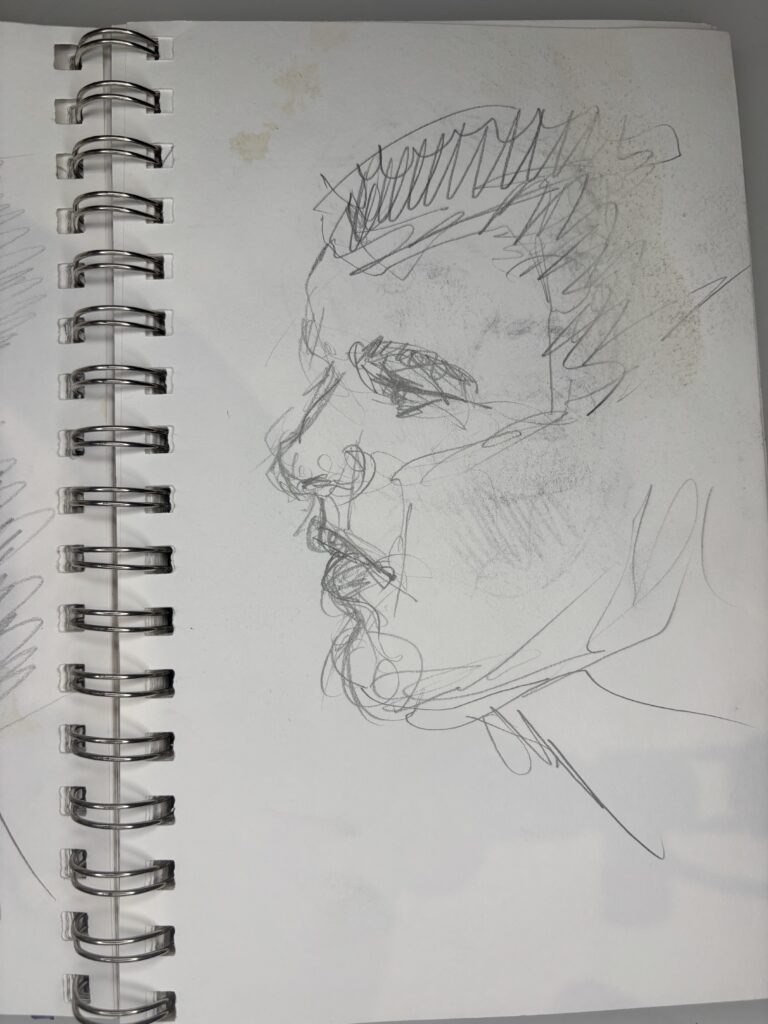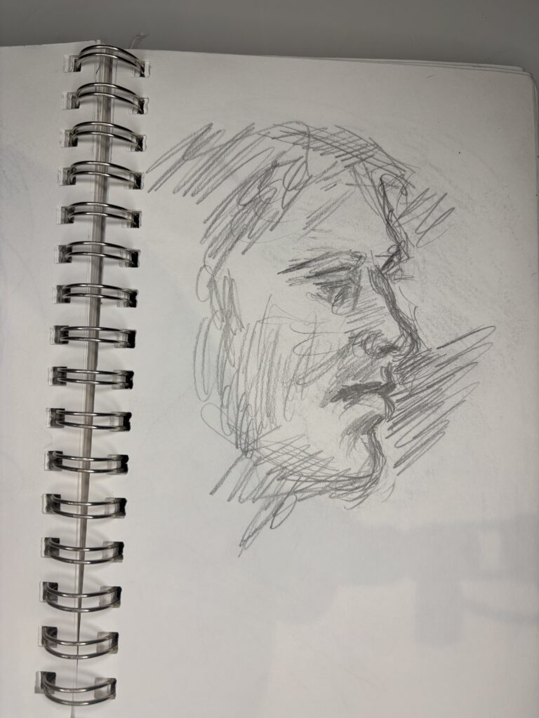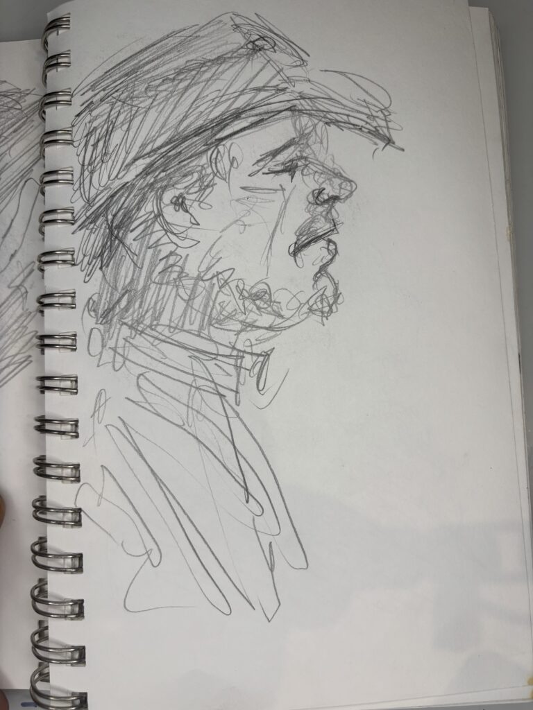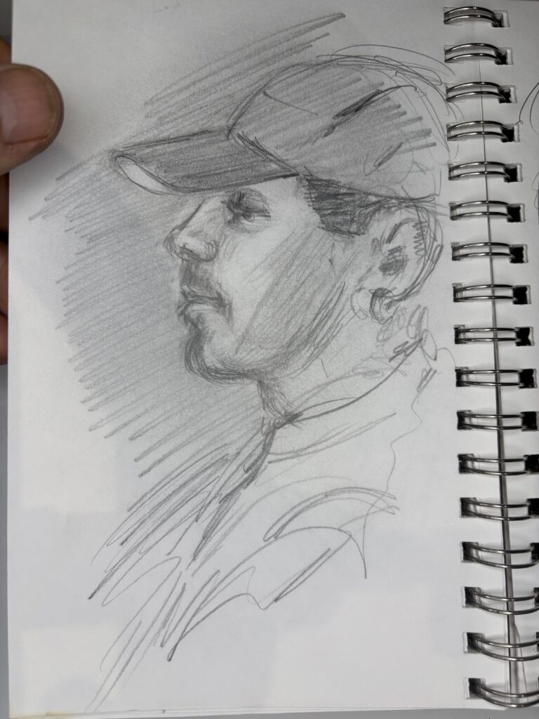 Drawing people who are not posing presents its challenges, but I love doing it. You have to draw quickly, and you don’t have time to complete the drawing properly when people move, turn away, get up, and leave while you are sketching them, which can make some drawings look distorted or wonky. These drawings were done in fast-food restaurants, bars, and airports.