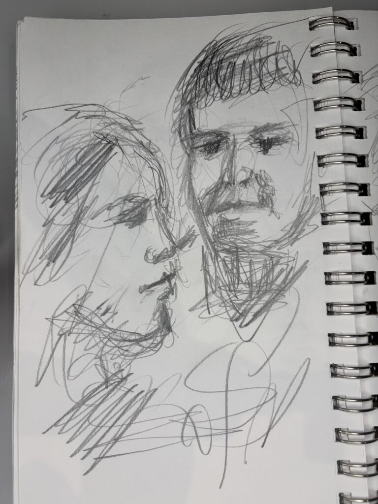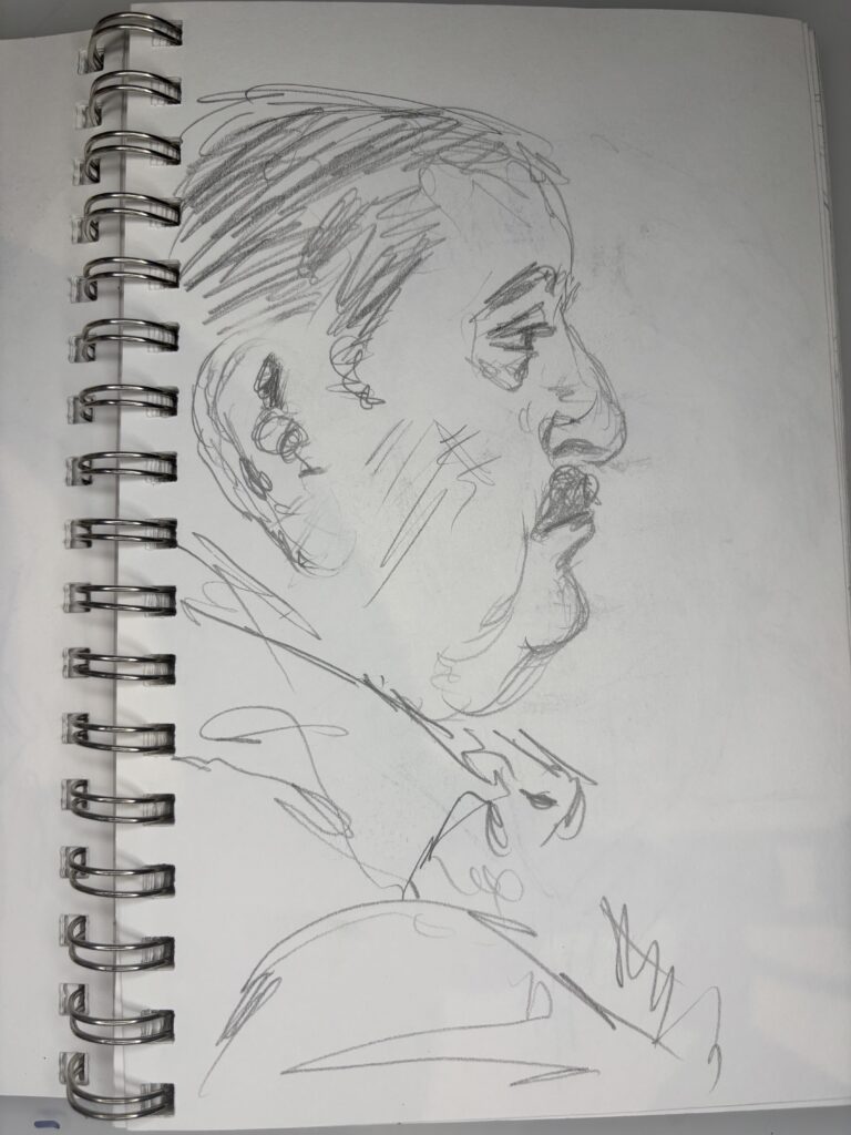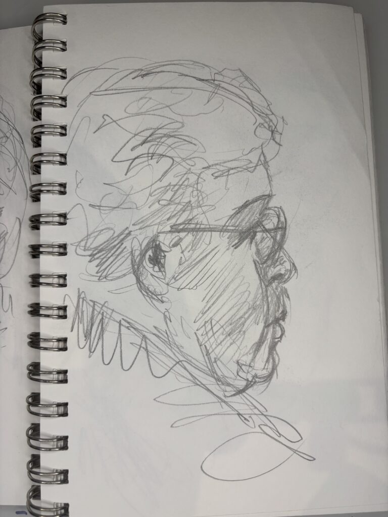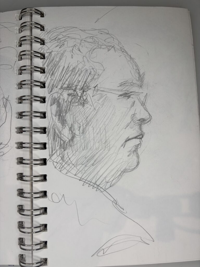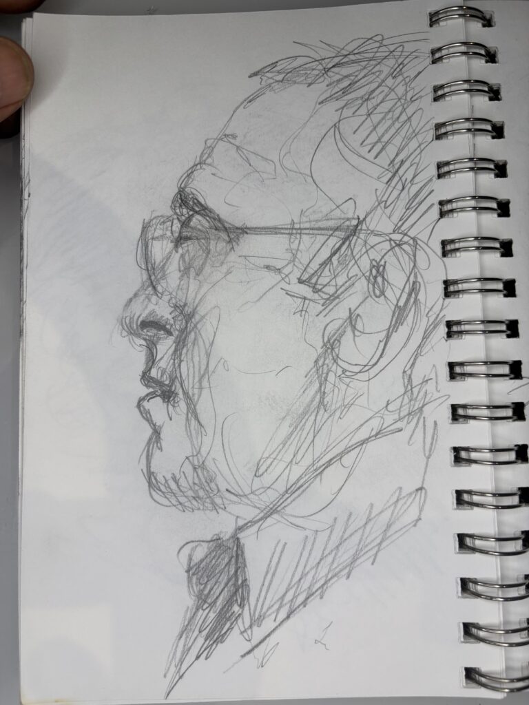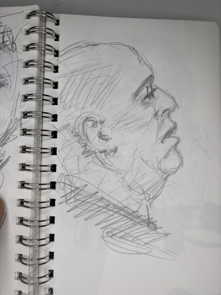 I’ve learned that in restaurants, it is best to draw only two people and start just after they sit down. The people will only look at the other person and their food. This gives you more time and a better chance to get a good likeness without interruptions.