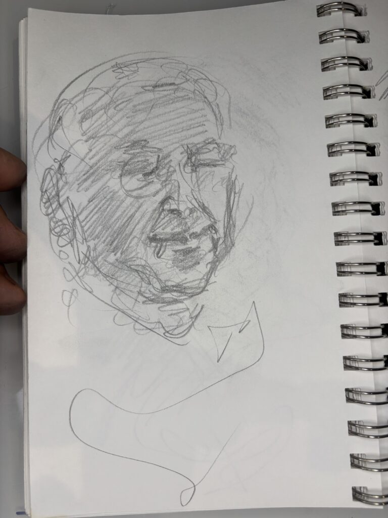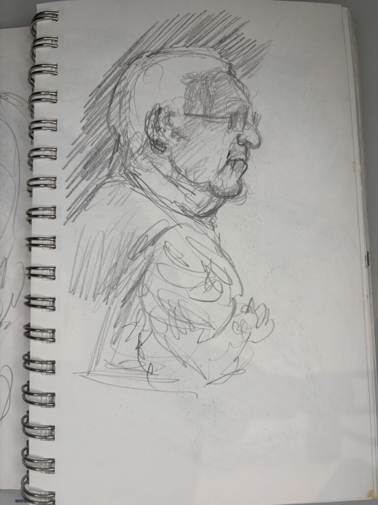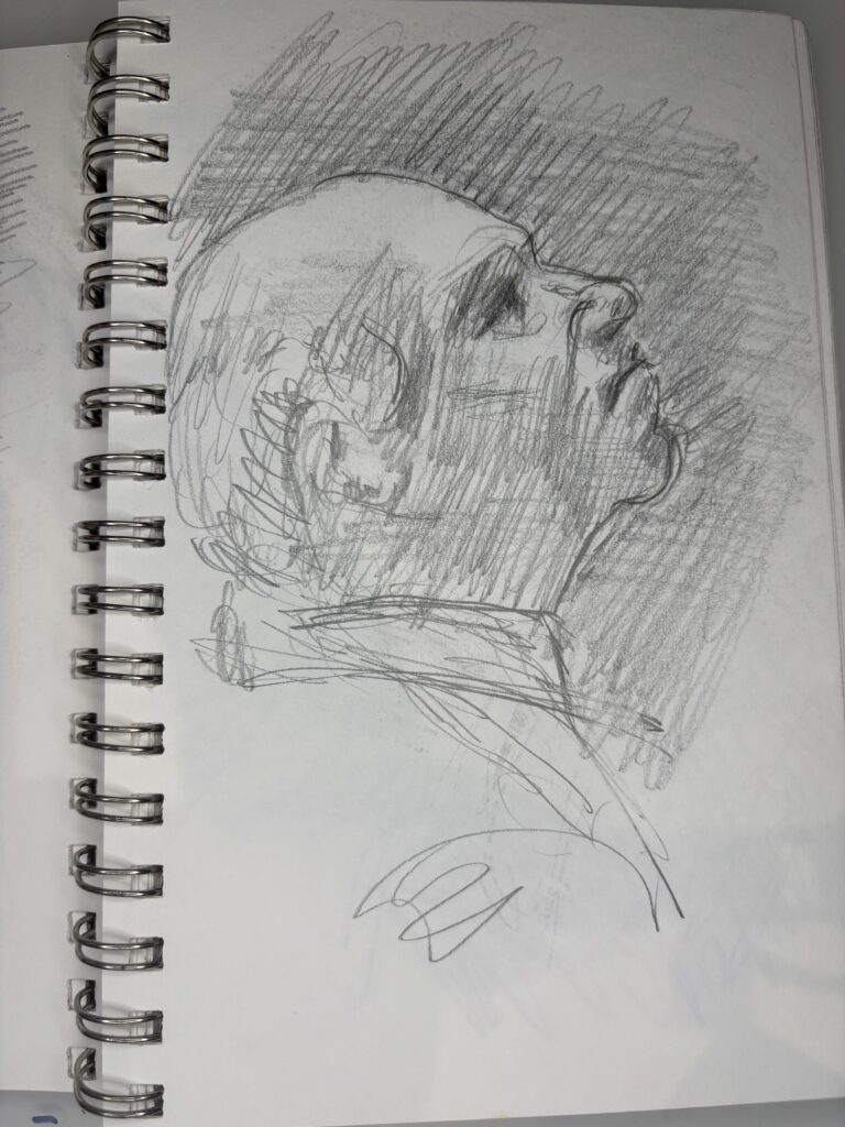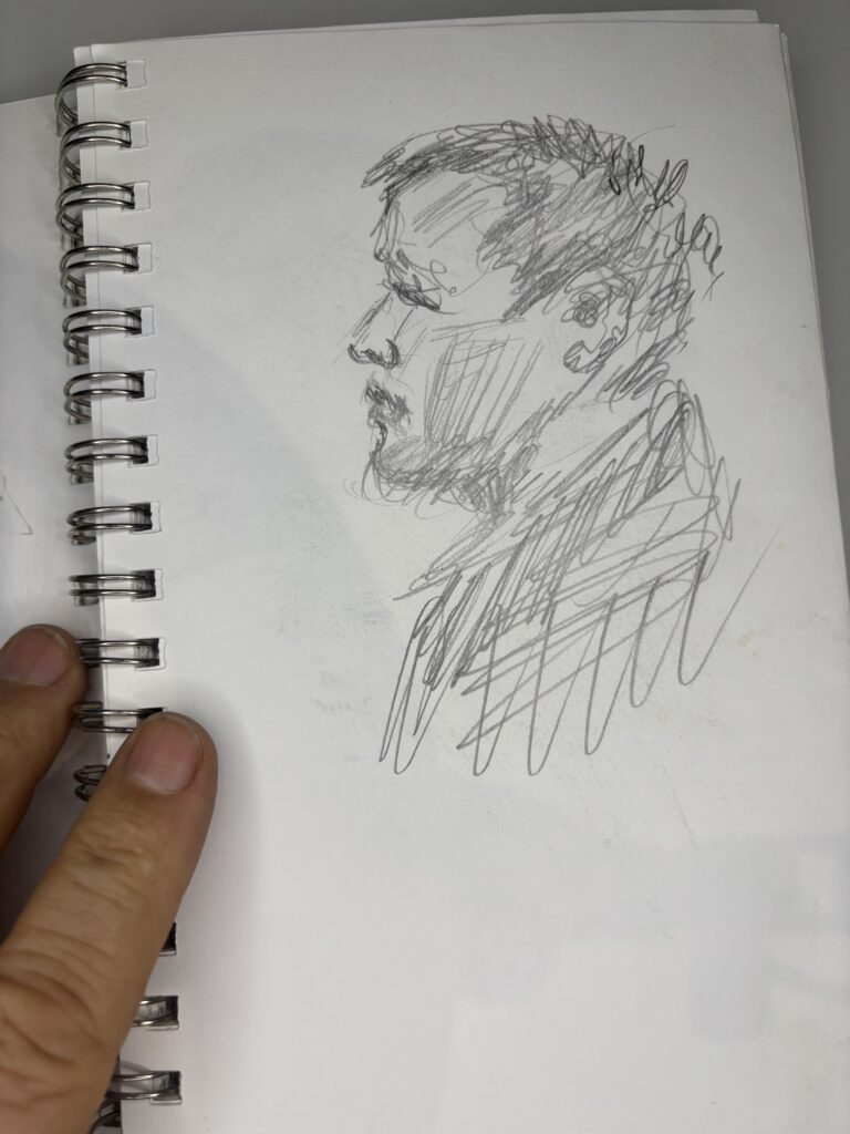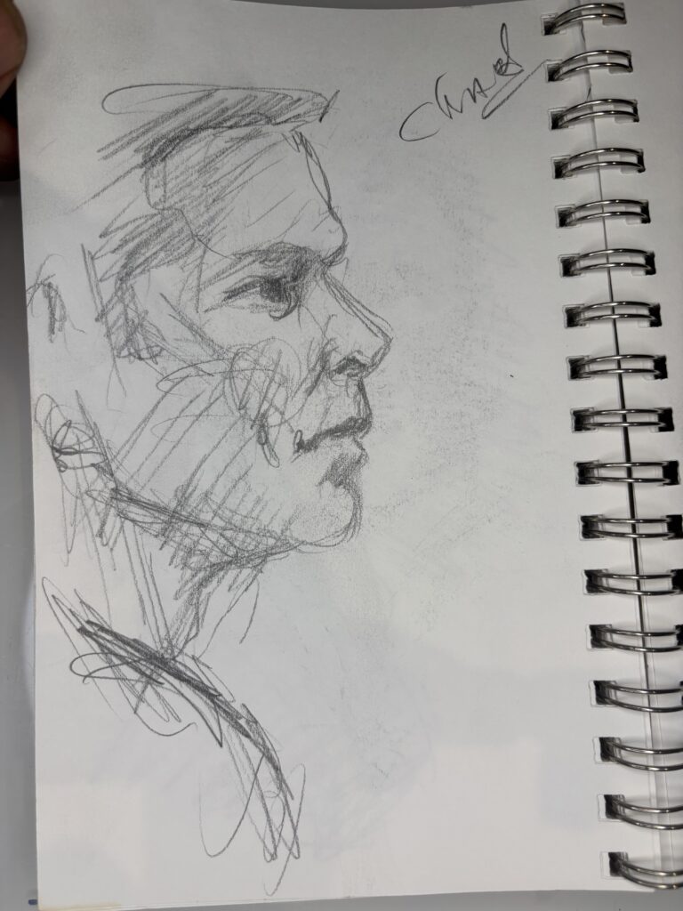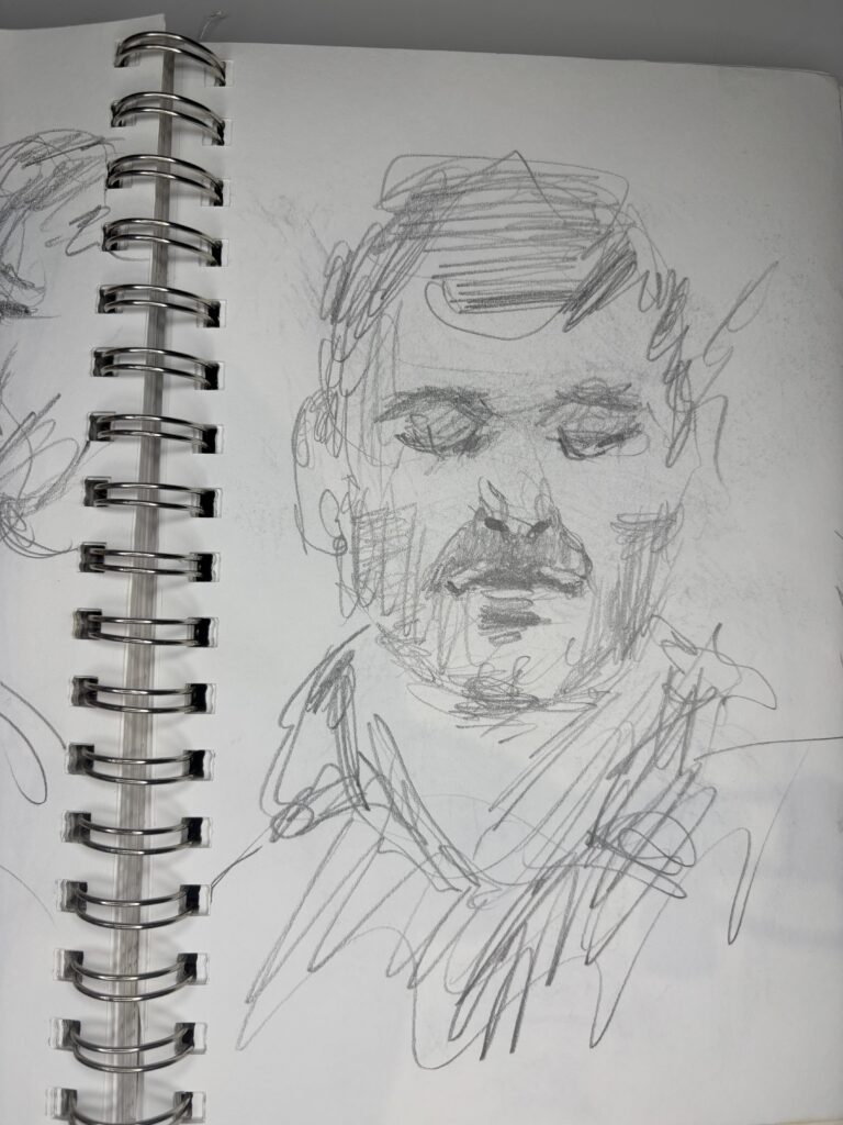 I’ve learned that in restaurants, it is best to draw only two people and start just after they sit down. The people will only look at the other person and their food. This gives you more time and a better chance to get a good likeness without interruptions.