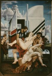 The next painting, “The Rape of the Daughters of Wooten.” I used “rape” in its original sense of “to snatch, grab, or carry off by force.” My inspiration came from Peter Paul Rubens’ painting, “The Rape of the Daughters of Leucippus.” I used the name Wooten, as in Wooten’s Airboats, a well known South Florida adventure ride. I was unaware that Mr. Wooten had daughters. Airboats were too low-slung to fit into the painting’s original composition. So Rubens’ horses became an 18-wheeler. My model was a beautiful blonde with a graceful figure; she was not overweight, but appeared full-figured when placed in the same position as the original work. Rubens chose poses so that the women, who were nude, would not appear as sex symbols but as symbols of nurturing and tendernesse.