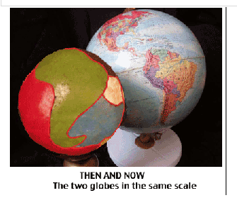 Here is that 3-D puzzle, shown with these two globes: the larger shows Earth with continents, and the smaller shows tracings of the continents from the larger applied to it. The East and West Indies were challenging. Here, the islands are fragmented, small, and difficult to piece together. Ultimately, this process resulted in a globe completely covered by land. Given the complex shapes of the continents, this model was surprisingly easy to build.