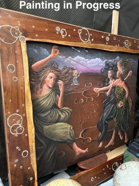 The next painting was inspired by the pockmarked surface of our Moon. I noticed two patterns that I discovered, but that I soon found on every cratered planet, moon, and asteroid in our solar system. The painting “Craters Cradle” was the result. It depicts 4 women, each representing a Moon goddess from a different culture: Celine, Coyolshallqui, Rhiannon, and Mana Quilla. Together, they are using a string to measure the craters, noting their roundness and the sequence of their formation.o.